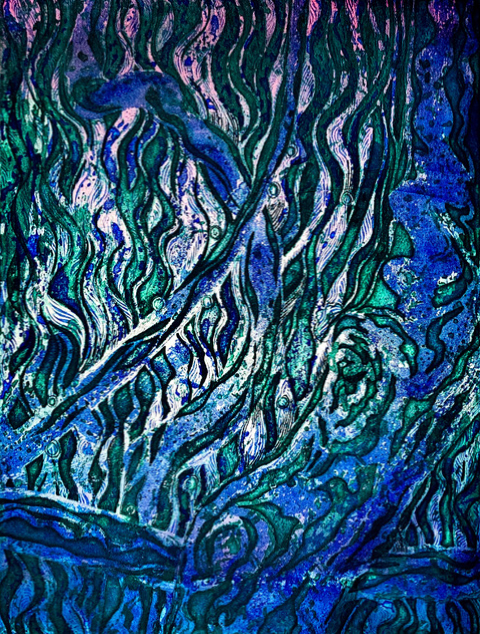 Collograph’s are magical, working from a collaged matrix of textures and layered materials sealed in shellac.