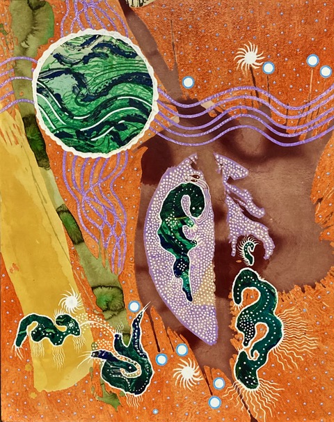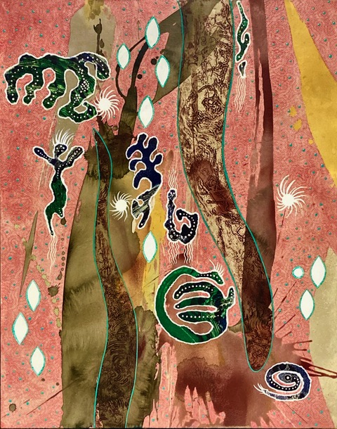 The following series of paintings investigate Buddhist ideas of the Five Elements as a portal into concepts of landscape and resulted in five bodies of work responding to the genius loci of landscapes as diverse as Lake Mungo, Kakadu, Mystery Bay, Central Western Desert and the Glasshouse Mountains.